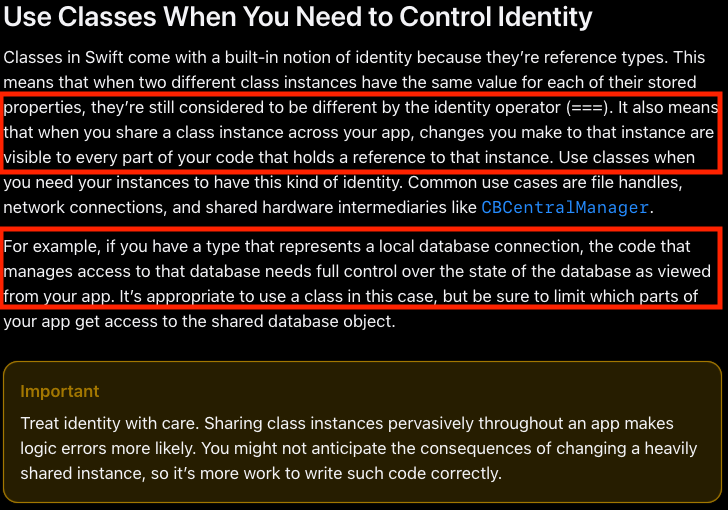 이렇게 애플에서 소개한 Struct 와 Class의 차이점을 보았습니다.