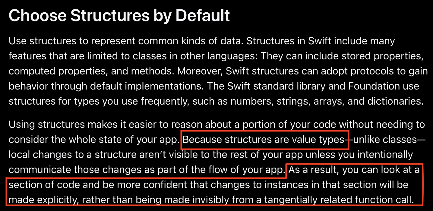 이유를 보시면 Struct는 value type이기 때문에 지역적 변경(local changes)이 앱 전반에 걸쳐 영향을 끼치지 않고, 결과적으로