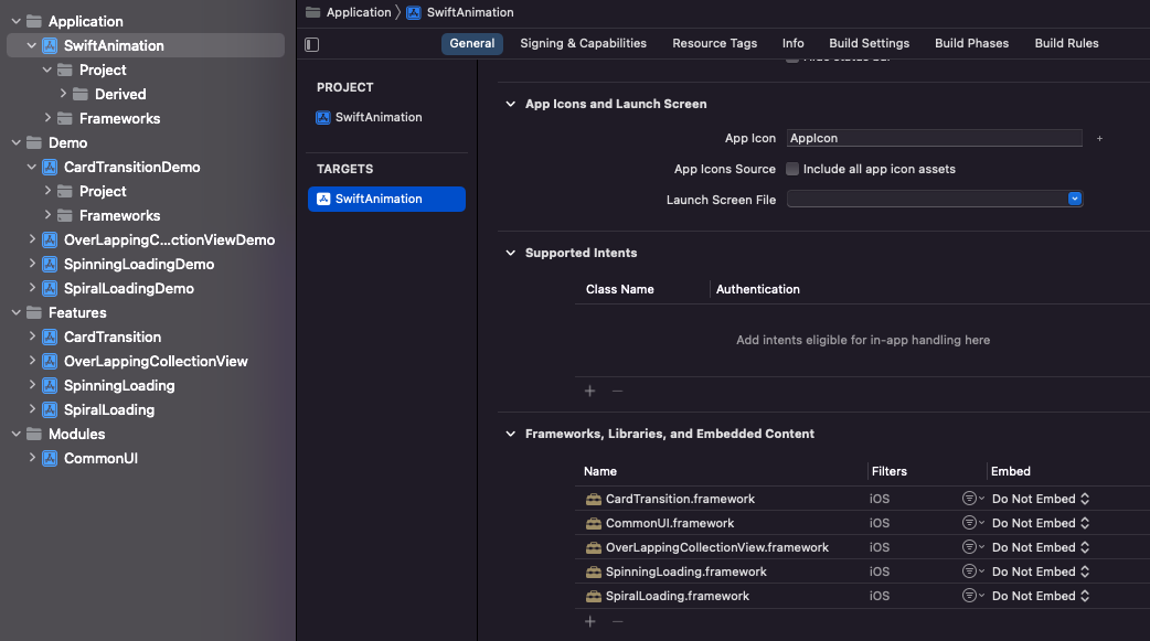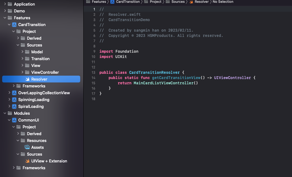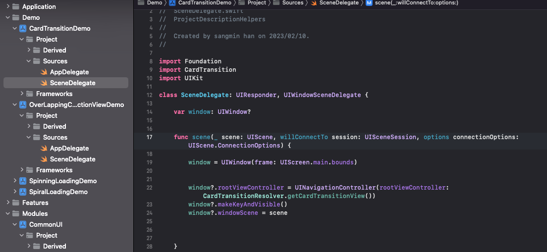 Features와 다른 점은 Demo App 이기 때문에 product가 .app의 형태이고 Features/Cardtransition에 대해서 추가적으로 의존하고 있다.