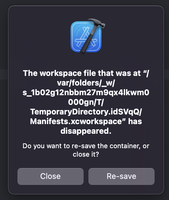 살짝 기다리면 xcode가 닫힘과 동시에 다음 팝업이 뜬다. 이때 close를 선택하면 된다.