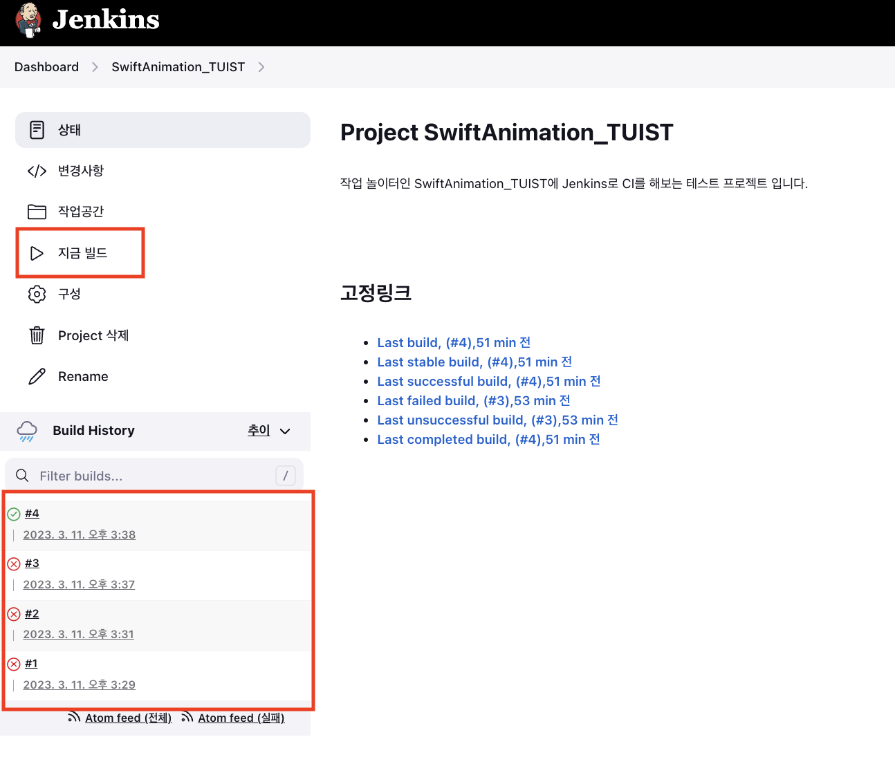 원래 자동으로 즉각 빌드 되게 Trigger를 설정해야 하지만 아직은 없으니 지금 빌드를 눌러서 수동으로 빌드 해봅시다.
