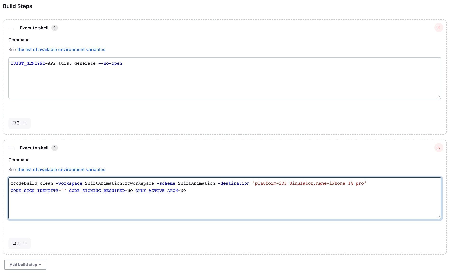 Build Steps에서 빌드를 위한 여러가지 명령어를 실행할 수 있습니다.