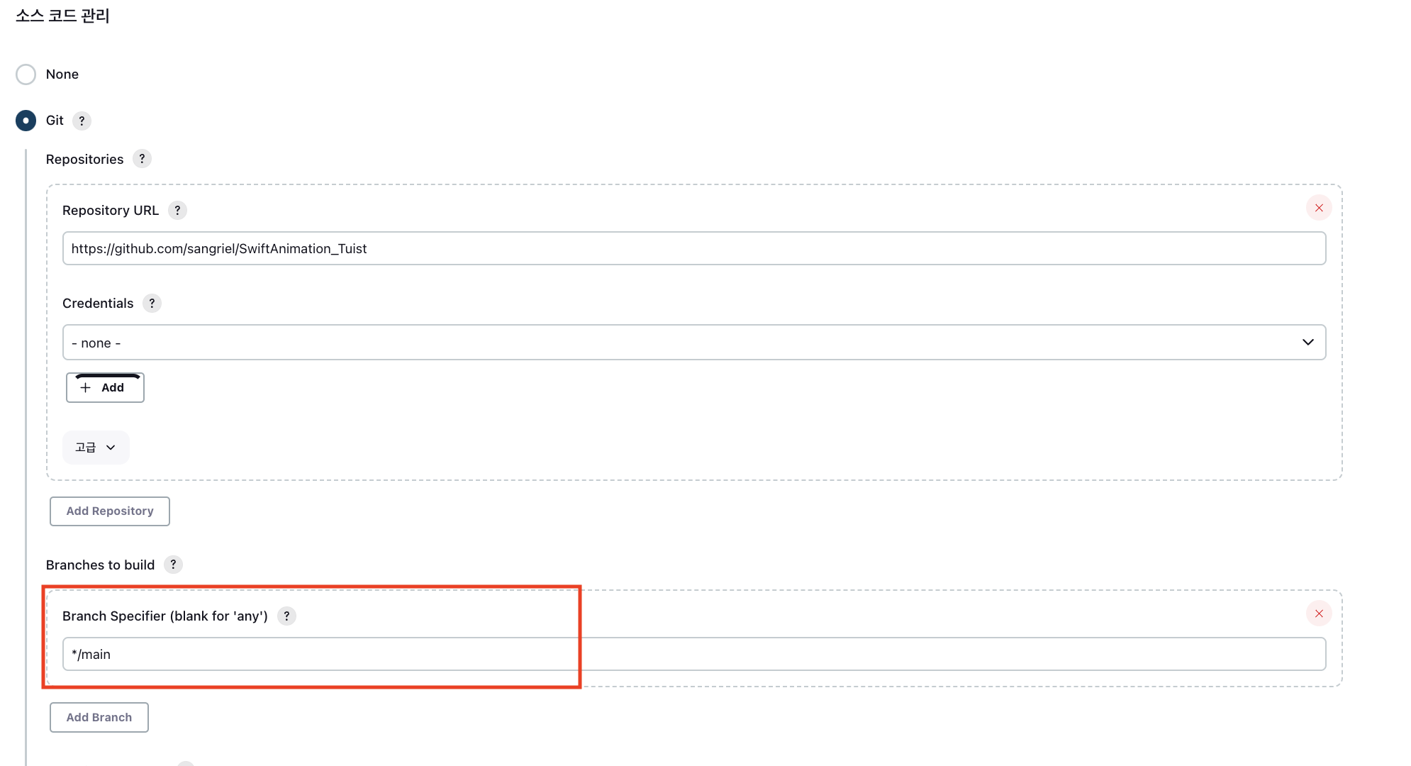 여기서 만약에 SSH로 github에 접속을 하고 싶다면 Credentials을 설정해 합니다. 하지만 저는 그냥 HTTP로 했기 때문에 넘어갑니다.