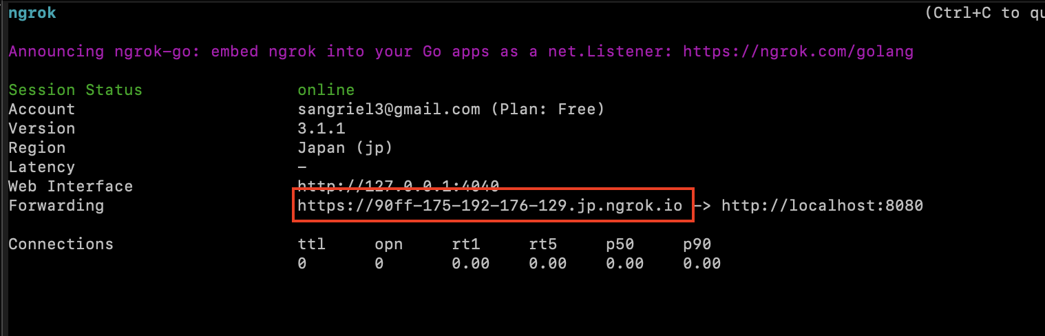 그리고 ngrok를 무료로 사용하면 실행할때마다 접속 url이 랜덤으로 배정된다.