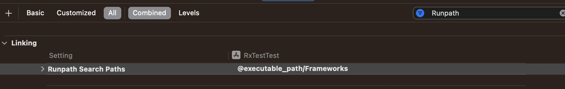 rPath의 경로는 xcode build setting에서 Runpath search path를 검색하면 나옵니다.