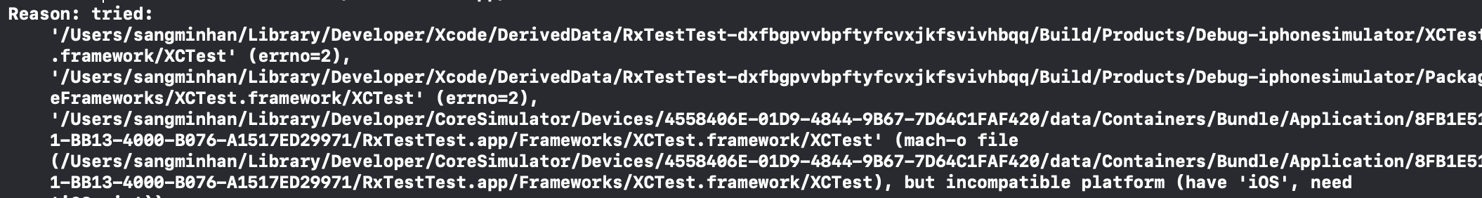 여기서 보면 @rPath/XCTest에서 프레임워크를 못 찾겠다고 나옵니다.