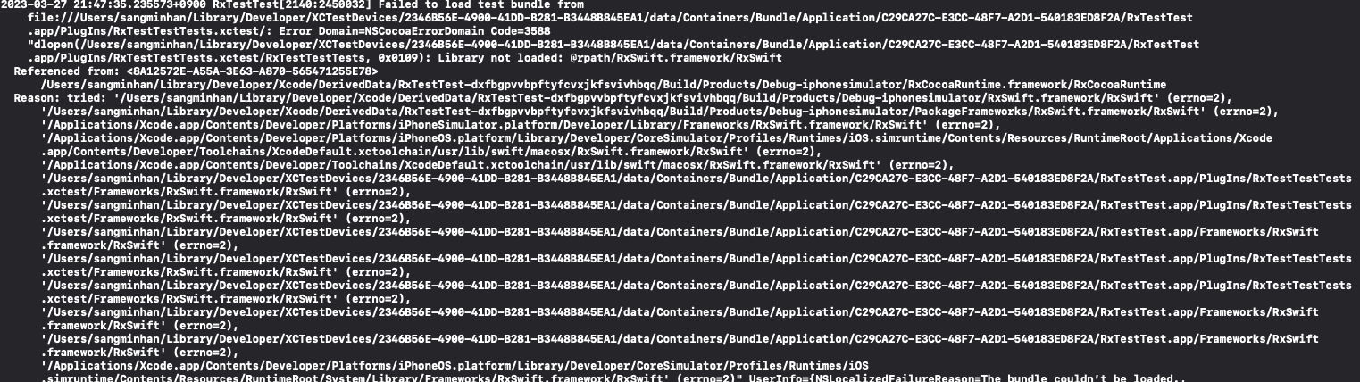 그리고 RxSwift를 /PlugIns/{name}Tests.xctest/{name}Tests 이 경로에서 찾고 있습니다.