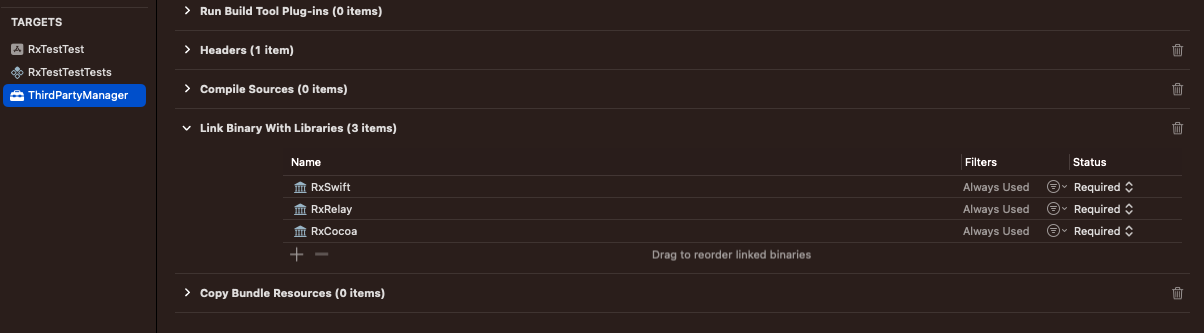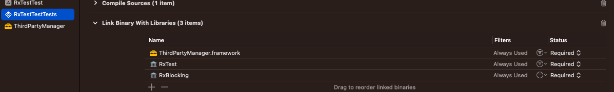 ThirdPartyManager에 RxTest와 RxBlocking을 추가하지 않은 이유는 MainApp에 추가하지 않는 것과 같은 이유입니다.