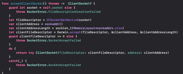 In Swift, Darwin.accept refers to a function provided by the Darwin module, which is a part of Apple's open-source implementation of the BSD APIs on macOS, iOS, and other Apple platforms.