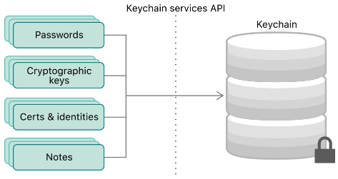 KeyChain 이번에는 저번 UserDefaults에 이어서 KeyChain에 대해서 알아보겠습니다. UserDefaults는 저번 시간에 .plist 파일에 key-value의 형태로 저장된다고 했습니다. 그리고 보안성도 좋지는 않다고 설명드렸습니다. 그럼 KeyChain은 어떤지 한번 알아보겠습니다. 1. 구성도 - KeyChain Service API 애플의 공식적인 문서를 보면 KeyChain에 대하여 다음과 같이 정의하고 있습니다. The keychain services API helps you solve this problem by giving your app a mechanism to store small bits of user data in an encrypted database call..
